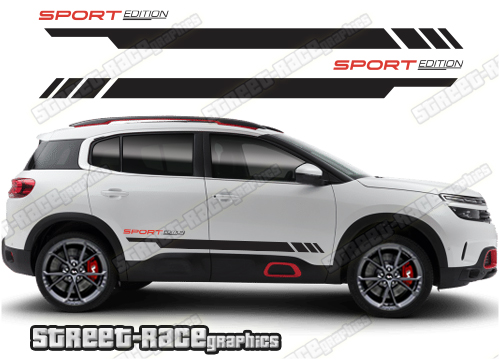 Citroen C5 Aircross racing stripes. They are shown on the first generation C5 Aircross but they can be trimmed to fit all later versions and facelift variants. The decals are not pre-cut for any specific Citroen C5 Aircross version; they do not have any door handle cutouts, wheel arch or door line splits. These will require trimming during fitting. Vinyl will not stick to unpainted textured plastics.