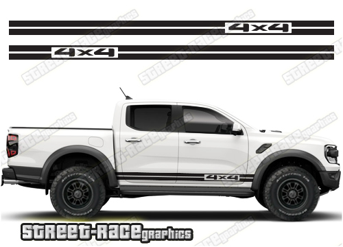 Ford Ranger side graphics. They are shown on the 4th generation dual cab, but they can be trimmed to fit all cab versions (single, crew and double cab) and facelift variants. Vinyl will not stick to textured surfaces such as unpainted wheel arch flares or raptor paint.