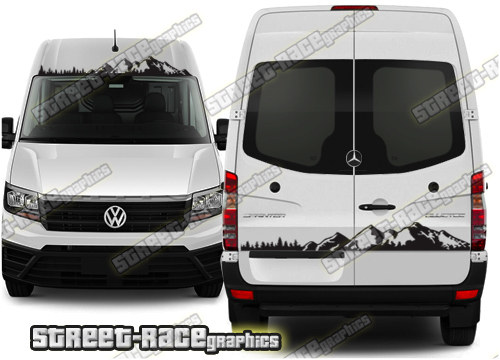 Campervan / Motorhome graphics kits. These are ideal for giving your existing camper a new look or to finish off a new camper conversion project. They are sized to fit the Mercedes Sprinter and VW Crafter (all years and variants).