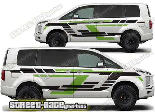 Mitsubishi Delica graphics: They are a universal fit designed to suit MK3 onwards and all facelift versions of these mid-sized vans. Also known as the Delica D:3 and Mitsubishi L300.  There are no cutouts for the wheel arches, door handles or door lines; these will require trimming during fitting.