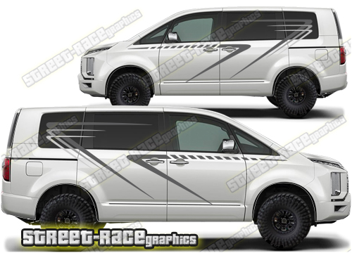 Mitsubishi Delica graphics: They are a universal fit designed to suit MK3 onwards and all facelift versions of these mid-sized vans. Also known as the Delica D:3 and Mitsubishi L300.  There are no cutouts for the wheel arches, door handles or door lines; these will require trimming during fitting.
