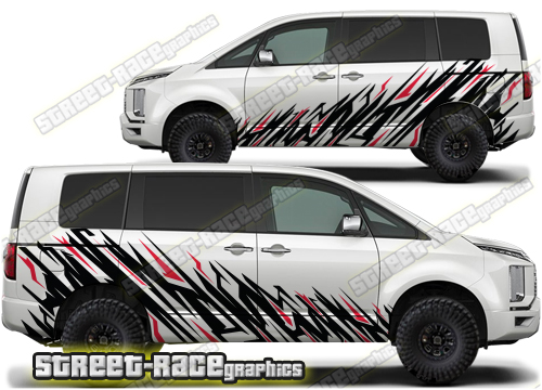 Mitsubishi Delica graphics: They are a universal fit designed to suit MK3 onwards and all facelift versions of these mid-sized vans. Also known as the Delica D:3 and Mitsubishi L300. There are no cutouts for the wheel arches, door handles or door lines; these will require trimming during fitting.