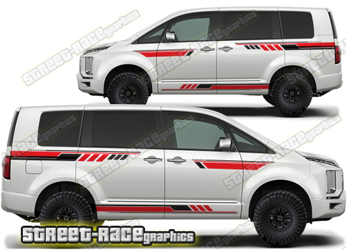 Mitsubishi Delica graphics: They are a universal fit designed to suit MK3 onwards and all facelift versions of these mid-sized vans. Also known as the Delica D:3 and Mitsubishi L300.  There are no cutouts for the wheel arches, door handles or door lines; these will require trimming during fitting.