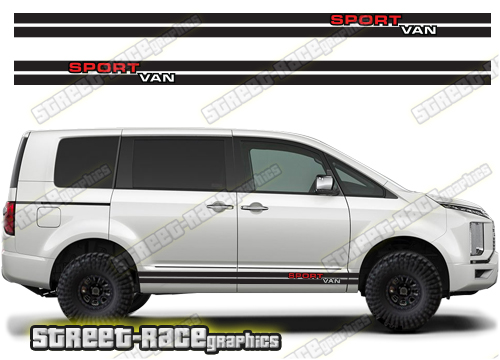 Mitsubishi Delica racing stripes: They are a universal fit designed to suit MK3 onwards and all facelift versions of these mid-sized vans. Also known as the Delica D:3 and Mitsubishi L300. There are no cutouts for the wheel arches, door handles or door lines; these will require trimming during fitting.