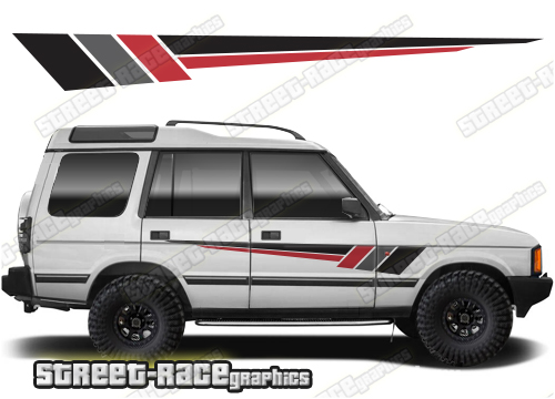 Land Rover Discovery racing stripes. They are shown on the second generation Land Rover Discovery but they will fit any Discovery 1 or 2. The decals are universal fit: they are not pre-cut for any specific Discovery 1 or 2. They do not have any door handle cutouts, wheel arch or door line splits. These will require trimming during fitting.