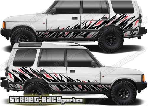 Land Rover Discovery graphics. They are shown on the second generation Land Rover Discovery but they will fit any Discovery 1 or 2. The decals are universal fit: they are not pre-cut for any specific Discovery 1 or 2. They do not have any door handle cutouts, wheel arch or door line splits. These will require trimming during fitting.