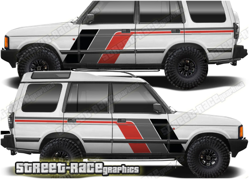 Land Rover Discovery graphics. They are shown on the second generation Land Rover Discovery but they will fit any Discovery 1 or 2. The decals are universal fit: they are not pre-cut for any specific Discovery 1 or 2. They do not have any door handle cutouts, wheel arch or door line splits. These will require trimming during fitting.