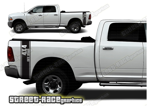 Dodge RAM off-road 4×4 tub stickers. This sticker kit will fit all Dodge RAM + facelift variants. To enable universal fit to all Dodge RAM trucks, the graphic is larger than required – the excess vinyl is simply trimmed off during fitting where it wraps around or butts up to the wheel arch and rear light.