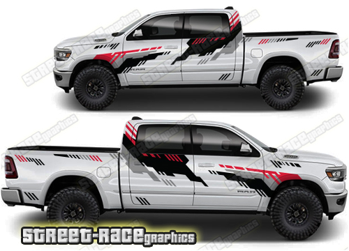 Dodge RAM large graphics. They are shown on the 4th generation dual cab 1500 Dodge RAM, but they can be trimmed to fit all earlier versions and facelift variants. The decals do not have any door handle cutouts, wheel arch or door line splits. These will require trimming during fitting. Vinyl will not stick to unpainted textured plastics.