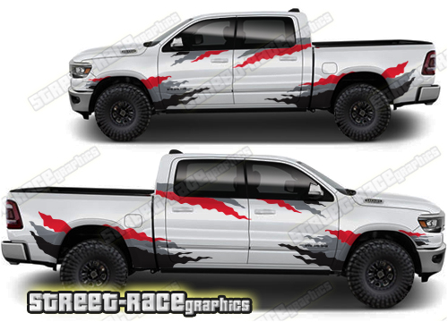 Dodge RAM large graphics. They are shown on the 4th generation dual cab 1500 Dodge RAM, but they can be trimmed to fit all earlier versions and facelift variants. The decals do not have any door handle cutouts, wheel arch or door line splits. These will require trimming during fitting. Vinyl will not stick to unpainted textured plastics.