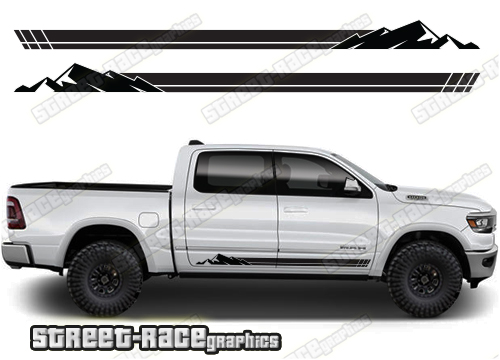 Dodge RAM racing stripes. They are shown on the 4th generation dual cab 1500 Dodge RAM, but they can be made / trimmed fit all earlier versions and facelift variants. The decals do not have any door handle cutouts, wheel arch or door line splits. These will require trimming during fitting. Vinyl will not stick to unpainted textured plastics.