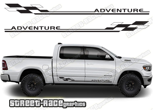 Dodge RAM racing stripes. They are shown on the 4th generation dual cab 1500 Dodge RAM, but they can be made / trimmed fit all earlier versions and facelift variants. The decals do not have any door handle cutouts, wheel arch or door line splits. These will require trimming during fitting. Vinyl will not stick to unpainted textured plastics.