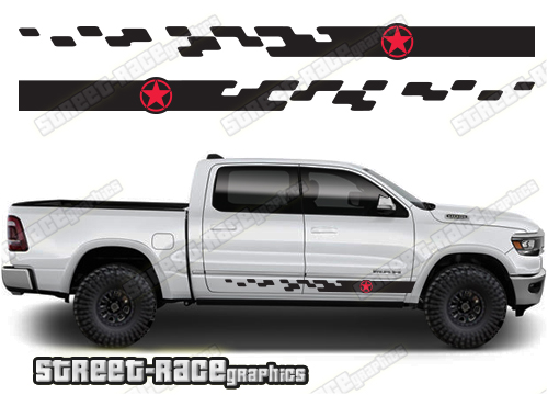 Dodge RAM racing stripes. They are shown on the 4th generation dual cab 1500 Dodge RAM, but they can be made / trimmed fit all earlier versions and facelift variants. The decals do not have any door handle cutouts, wheel arch or door line splits. These will require trimming during fitting. Vinyl will not stick to unpainted textured plastics.