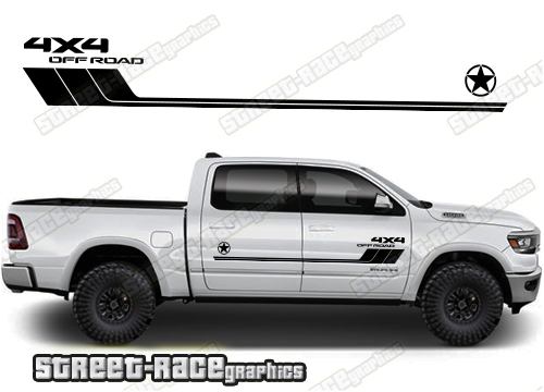 Dodge RAM racing stripes. They are shown on the 4th generation dual cab 1500 Dodge RAM, but they can be made / trimmed fit all earlier versions and facelift variants. The decals do not have any door handle cutouts, wheel arch or door line splits. These will require trimming during fitting. Vinyl will not stick to unpainted textured plastics.