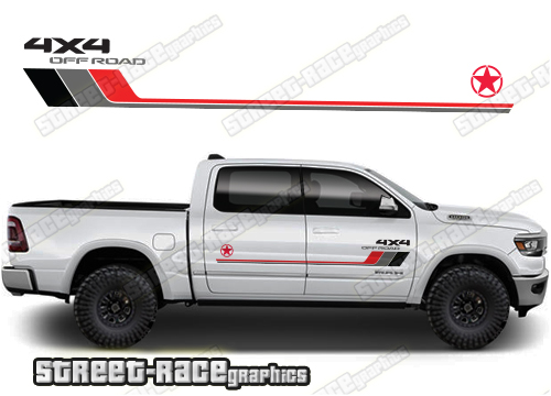Dodge RAM stickers. They are shown on the 4th generation dual cab 1500 Dodge RAM, but they can be made / trimmed fit all earlier versions and facelift variants. The decals do not have any door handle cutouts, wheel arch or door line splits. These will require trimming during fitting. Vinyl will not stick to unpainted textured plastics.