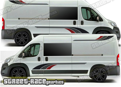 Campervan / Motorhome graphics kits. These are ideal for giving your existing camper a new look or to finish off a new camper conversion project. They are sized to fit the Peugeot Boxer, Citroen Relay and the Fiat Ducato. Shown on the L3 (LWB) minibus van with full length glass windows. We can also make them to suit the L4 (XLWB) van (choose the wheelbase length from the menu below).