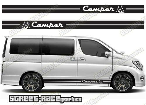 Nissan Elgrand racing stripes. Great for a camper or race van conversion. They are a universal fit to suit all Nissan Elgrand vans and facelift variants from MK1 onwards. There are no cutouts for the wheel arches or door lines, these will require trimming during fitting.