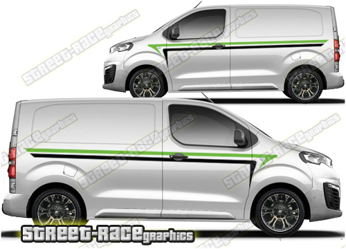 Peugeot Expert large side graphics. Great for a camper or race van conversion. They are a universal fit to suit all Peugeot Expert vans and facelift variants from MK2 onwards. There are no cutouts for the door handles, wheel arches or door lines, these will require trimming during fitting. Shown on the short wheelbase (SWB) Peugeot Expert van, but we can also make them to fit the long wheelbase (LWB).