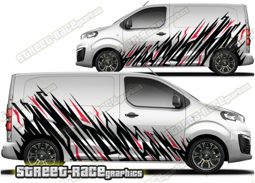 Peugeot Expert large side graphics. Great for a camper or race van conversion. They are a universal fit to suit all Peugeot Expert vans and facelift variants from MK2 onwards. There are no cutouts for the door handles, wheel arches or door lines, these will require trimming during fitting. Shown on the short wheelbase (SWB) Peugeot Expert van, but we can also make them to fit the long wheelbase (LWB).