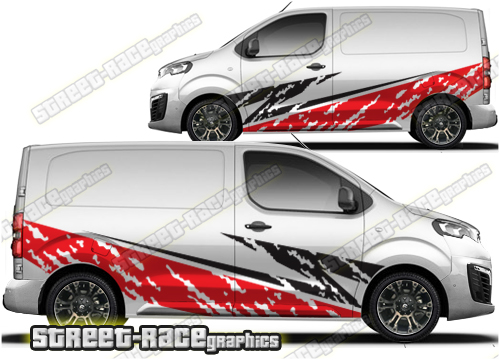 Peugeot Expert large side graphics. Great for a camper or race van conversion. They are a universal fit to suit all Peugeot Expert vans and facelift variants from MK2 onwards. There are no cutouts for the door handles, wheel arches or door lines, these will require trimming during fitting. Shown on the short wheelbase (SWB) Peugeot Expert van, but we can also make them to fit the long wheelbase (LWB).