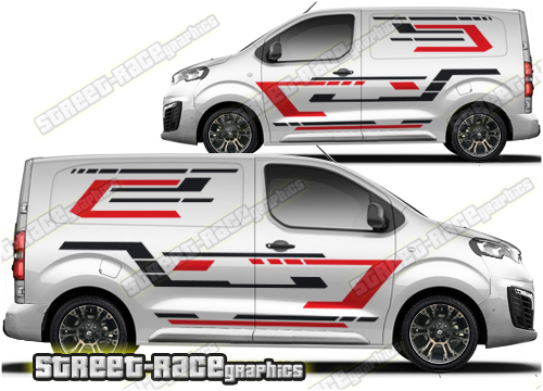 Peugeot Expert large side graphics. Great for a camper or race van conversion. They are a universal fit to suit all Peugeot Expert vans and facelift variants from MK2 onwards. There are no cutouts for the door handles, wheel arches or door lines, these will require trimming during fitting. Shown on the short wheelbase (SWB) Peugeot Expert van, but we can also make them to fit the long wheelbase (LWB).