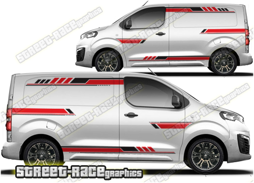 Peugeot Expert large side graphics. Great for a camper or race van conversion. They are a universal fit to suit all Peugeot Expert vans and facelift variants from MK2 onwards. There are no cutouts for the door handles, wheel arches or door lines, these will require trimming during fitting. Shown on the short wheelbase (SWB) Peugeot Expert van, but we can also make them to fit the long wheelbase (LWB).