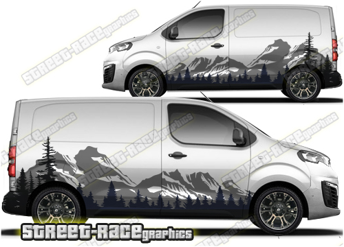 Peugeot Expert large side graphics. Great for a camper or race van conversion. They are a universal fit to suit all Peugeot Expert vans and facelift variants from MK2 onwards. There are no cutouts for the door handles, wheel arches or door lines, these will require trimming during fitting. Shown on the short wheelbase (SWB) Peugeot Expert van, but we can also make them to fit the long wheelbase (LWB).