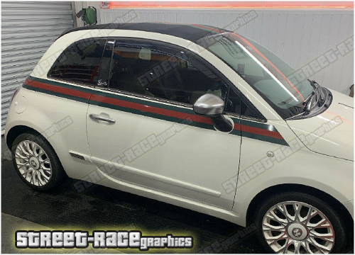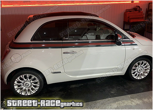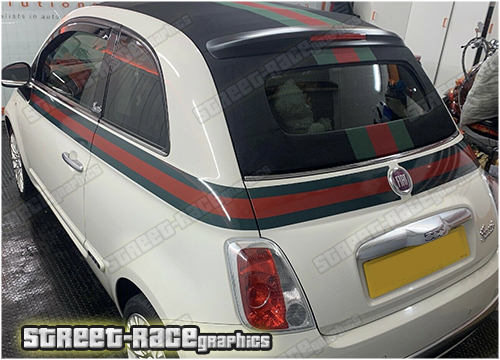 Our Fiat 500 Gucci style stickers are hugely popular and we usually hold a good amount of stock of these items, ready for immediate dispatch. Included are side and rear racing stripe graphics using the Gucci colours, digitally printed and laminated for increased durability.