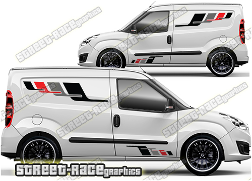 Fiat Doblo large side graphics. The decals are universal fit: they are not pre-cut for any specific Doblo so they will be suitable for any facelift variants. They do not have any door handle cutouts, wheel arch or door line splits. These will require trimming during fitting.