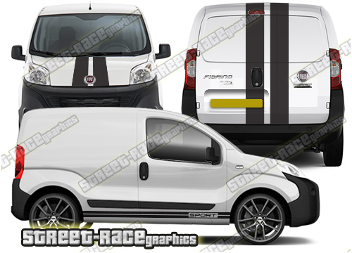 Full racing stripes to suit the Fiat Fiorino, Citroen Nemo and Peugeot Bipper vans. Included are side stripes, bonnet/bumper and rear door stripes. Shown fitted to the third generation, but they are universal fit. They are not trimmed for any specific Fiorino/Nemo/Bipper – there are no cutouts for the wheel arches, door handles, badges, windows or door lines: these will require trimming during fitting.