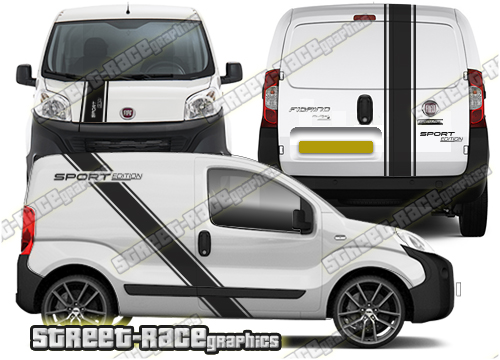 Full racing stripes to suit the Fiat Fiorino, Citroen Nemo and Peugeot Bipper vans. Included are side stripes, bonnet/bumper and rear door stripes. Shown fitted to the third generation, but they are universal fit. They are not trimmed for any specific Fiorino/Nemo/Bipper – there are no cutouts for the wheel arches, door handles, badges, windows or door lines: these will require trimming during fitting.