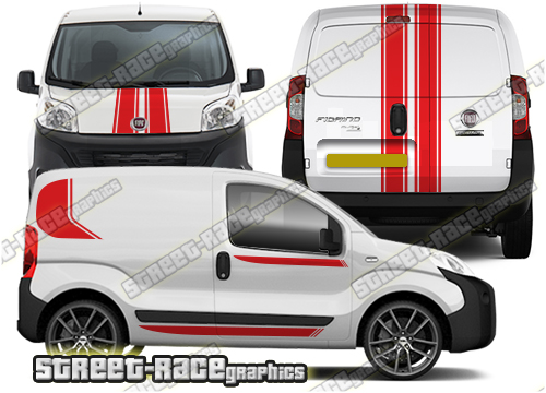 Full racing stripes to suit the Fiat Fiorino, Citroen Nemo and Peugeot Bipper vans. Included are side stripes, bonnet/bumper and rear door stripes. Shown fitted to the third generation, but they are universal fit. They are not trimmed for any specific Fiorino/Nemo/Bipper – there are no cutouts for the wheel arches, door handles, badges, windows or door lines: these will require trimming during fitting.