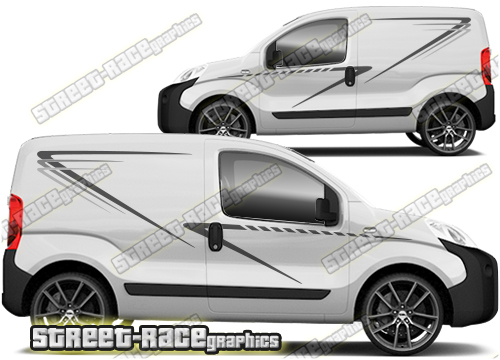 Large graphics for the Fiat Fiorino, Citroen Nemo and Peugeot Bipper vans. They are shown fitted to the third generation van, but they are universal fit. They are not trimmed for any specific Fiorino/Nemo/Bipper – there are no cutouts for the wheel arches, door handles, badges, windows or door lines: these will require trimming during fitting.