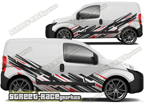 Large graphics for the Fiat Fiorino, Citroen Nemo and Peugeot Bipper vans. They are shown fitted to the third generation van, but they are universal fit. They are not trimmed for any specific Fiorino/Nemo/Bipper – there are no cutouts for the wheel arches, door handles, badges, windows or door lines: these will require trimming during fitting.