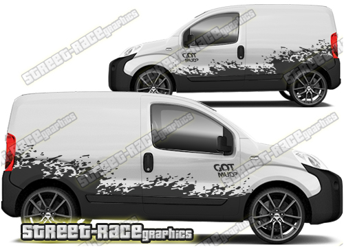 Large graphics for the Fiat Fiorino, Citroen Nemo and Peugeot Bipper vans. They are shown fitted to the third generation van, but they are universal fit. They are not trimmed for any specific Fiorino/Nemo/Bipper – there are no cutouts for the wheel arches, door handles, badges, windows or door lines: these will require trimming during fitting.