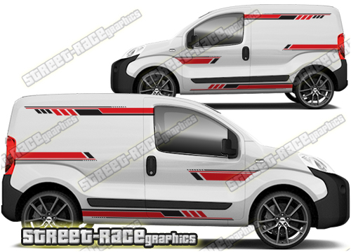 Large graphics for the Fiat Fiorino, Citroen Nemo and Peugeot Bipper vans. They are shown fitted to the third generation van, but they are universal fit. They are not trimmed for any specific Fiorino/Nemo/Bipper – there are no cutouts for the wheel arches, door handles, badges, windows or door lines: these will require trimming during fitting.