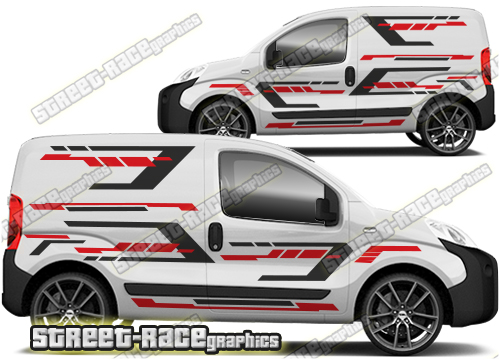 Large graphics for the Fiat Fiorino, Citroen Nemo and Peugeot Bipper vans. They are shown fitted to the third generation van, but they are universal fit. They are not trimmed for any specific Fiorino/Nemo/Bipper – there are no cutouts for the wheel arches, door handles, badges, windows or door lines: these will require trimming during fitting.