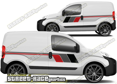 Large graphics for the Fiat Fiorino, Citroen Nemo and Peugeot Bipper vans. They are shown fitted to the third generation van, but they are universal fit. They are not trimmed for any specific Fiorino/Nemo/Bipper – there are no cutouts for the wheel arches, door handles, badges, windows or door lines: these will require trimming during fitting.