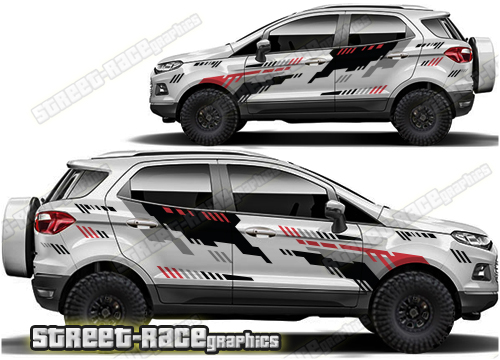 Ford EcoSport graphics. They are shown on the second generation EcoSport but they can be trimmed to fit all later versions and facelift variants. The decals are not pre-cut for any specific Ford EcoSport version; they do not have any door handle cutouts, wheel arch or door line splits. These will require trimming during fitting. Vinyl will not stick to unpainted textured plastics.
