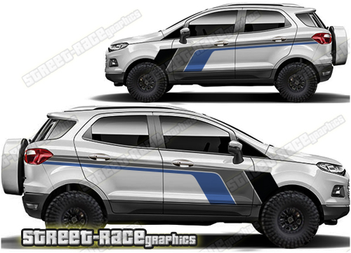Ford EcoSport graphics. They are shown on the second generation EcoSport but they can be trimmed to fit all later versions and facelift variants. The decals are not pre-cut for any specific Ford EcoSport version; they do not have any door handle cutouts, wheel arch or door line splits. These will require trimming during fitting. Vinyl will not stick to unpainted textured plastics.