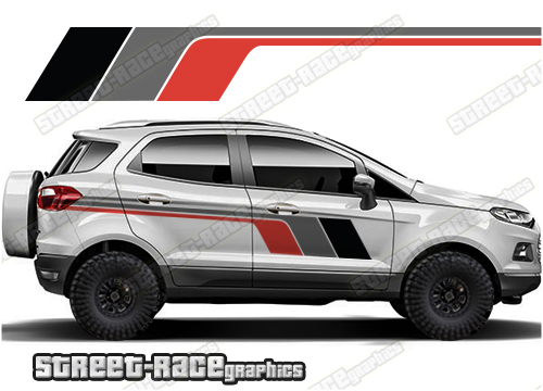 Ford EcoSport racing stripes. They are shown on the second generation EcoSport but they can be trimmed to fit all later versions and facelift variants. The decals are not pre-cut for any specific Ford EcoSport version; they do not have any door handle cutouts, wheel arch or door line splits. These will require trimming during fitting. Vinyl will not stick to unpainted textured plastics.