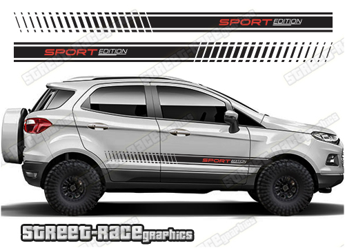 Ford EcoSport racing stripes. They are shown on the second generation EcoSport but they can be trimmed to fit all later versions and facelift variants. The decals are not pre-cut for any specific Ford EcoSport version; they do not have any door handle cutouts, wheel arch or door line splits. These will require trimming during fitting. Vinyl will not stick to unpainted textured plastics.