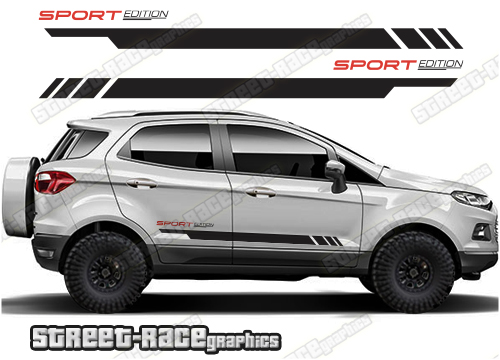 Ford EcoSport racing stripes. They are shown on the second generation EcoSport but they can be trimmed to fit all later versions and facelift variants. The decals are not pre-cut for any specific Ford EcoSport version; they do not have any door handle cutouts, wheel arch or door line splits. These will require trimming during fitting. Vinyl will not stick to unpainted textured plastics.
