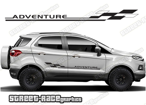 Ford EcoSport racing stripes. They are shown on the second generation EcoSport but they can be trimmed to fit all later versions and facelift variants. The decals are not pre-cut for any specific Ford EcoSport version; they do not have any door handle cutouts, wheel arch or door line splits. These will require trimming during fitting. Vinyl will not stick to unpainted textured plastics.