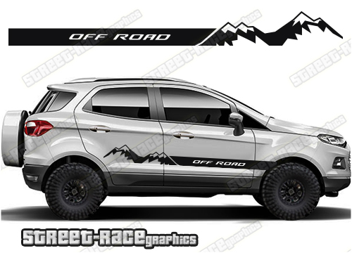 Ford EcoSport racing stripes. They are shown on the second generation EcoSport but they can be trimmed to fit all later versions and facelift variants. The decals are not pre-cut for any specific Ford EcoSport version; they do not have any door handle cutouts, wheel arch or door line splits. These will require trimming during fitting. Vinyl will not stick to unpainted textured plastics.