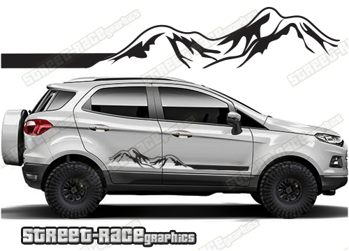 Ford EcoSport racing stripes. They are shown on the second generation EcoSport but they can be trimmed to fit all later versions and facelift variants. The decals are not pre-cut for any specific Ford EcoSport version; they do not have any door handle cutouts, wheel arch or door line splits. These will require trimming during fitting. Vinyl will not stick to unpainted textured plastics.