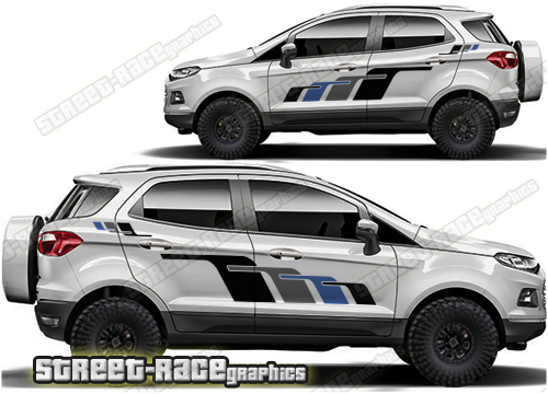 Ford EcoSport graphics. They are shown on the second generation EcoSport but they can be trimmed to fit all later versions and facelift variants. The decals are not pre-cut for any specific Ford EcoSport version; they do not have any door handle cutouts, wheel arch or door line splits. These will require trimming during fitting. Vinyl will not stick to unpainted textured plastics.