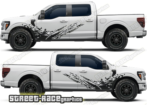 Ford F-150 side graphics. They are shown on the 14th generation dual cab F-150 XLT, but they can be trimmed to fit all cab versions (single, crew and double cab) and facelift variants. The graphics will also fit other F-Series trucks (F-250 & F-350) and earlier versions (12th & 13th gen).