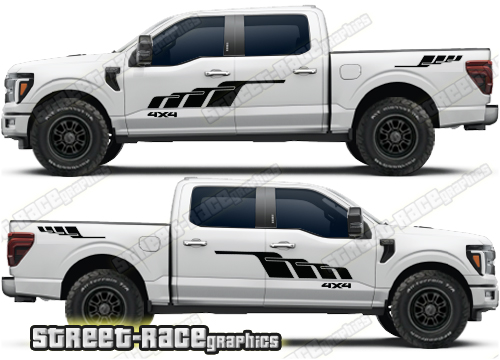 Ford F-150 side graphics. They are shown on the 14th generation dual cab F-150 XLT, but they can be trimmed to fit all cab versions (single, crew and double cab) and facelift variants. The graphics will also fit other F-Series trucks (F-250 & F-350) and earlier versions (12th & 13th gen).
