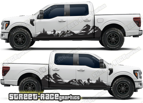 Ford F-150 side graphics. They are shown on the 14th generation dual cab F-150 XLT, but they can be trimmed to fit all cab versions (single, crew and double cab) and facelift variants. The graphics will also fit other F-Series trucks (F-250 & F-350) and earlier versions (12th & 13th gen).